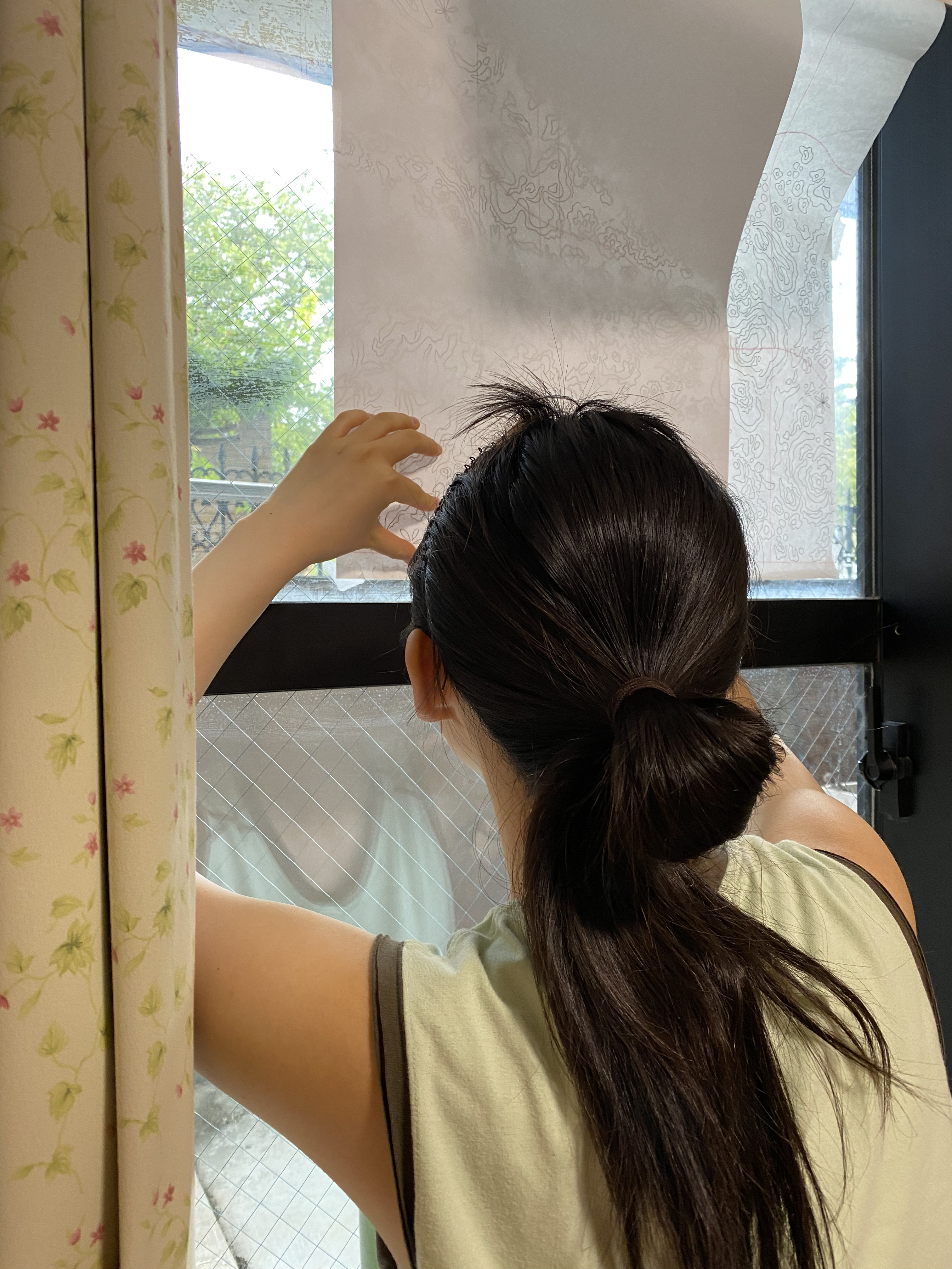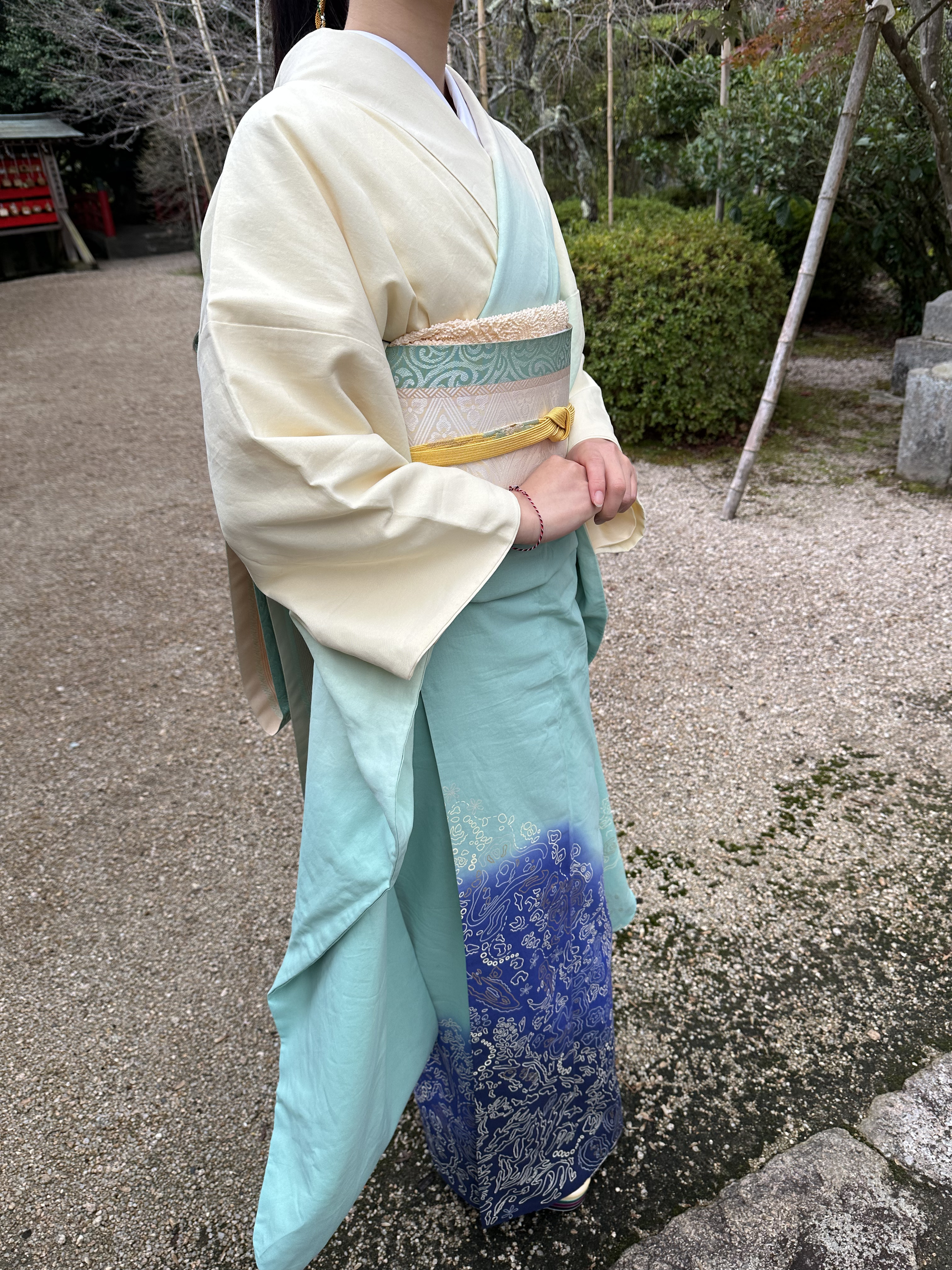 和紙素材の着物に糸目友禅を施しています。色から柄まで完全オリジナルデザインで世界に一つだけの振袖をつくることができました。